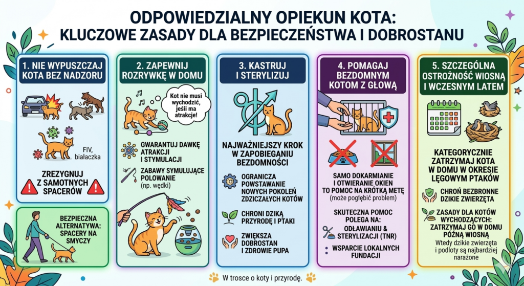 Ochrona przyrody zaczyna się tuż za progiem naszego domu. Odpowiedzialna opieka nad kotem to nie tylko pełna miska i wizyty u weterynarza, ale też świadomość i dbałość o to, by nasz mruczący przyjaciel nie stawał się zagrożeniem dla otaczającego nas świata.